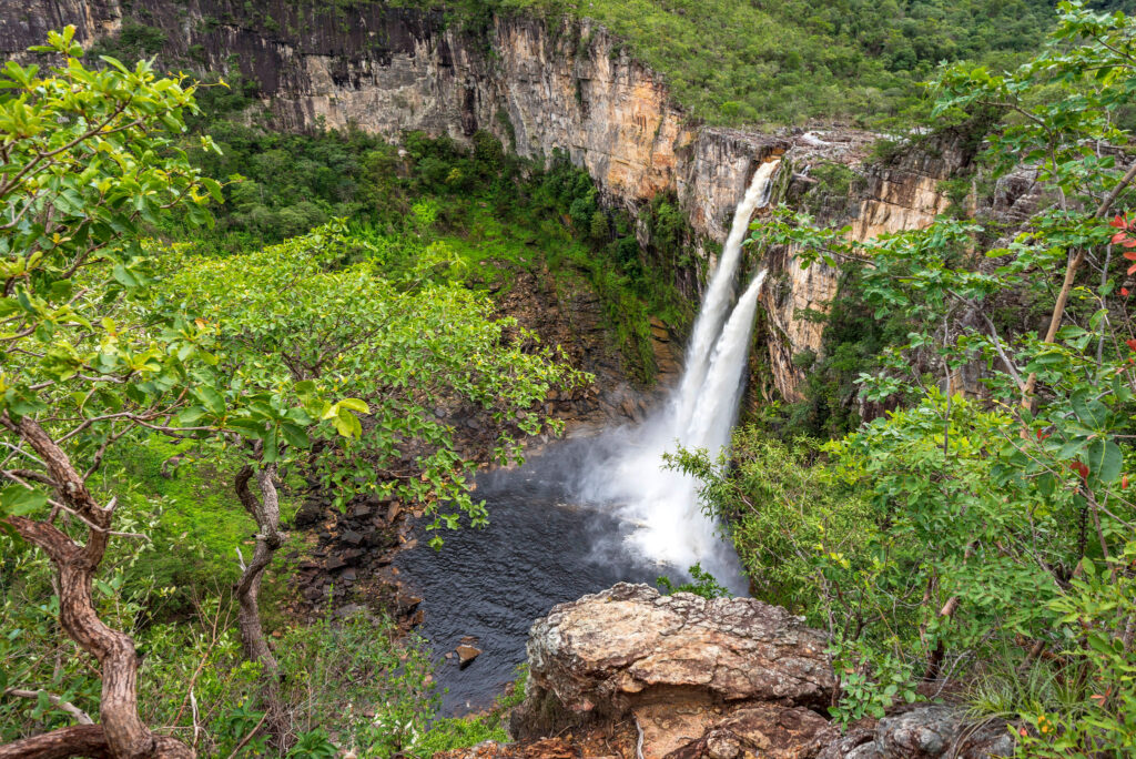Possui dezenas de trilhas, grutas e cachoeiras. É considerada a Disney do turismo de aventura. A famosa Cachoeira da Fumaça tem 380 metros de altura. Foto: Canva