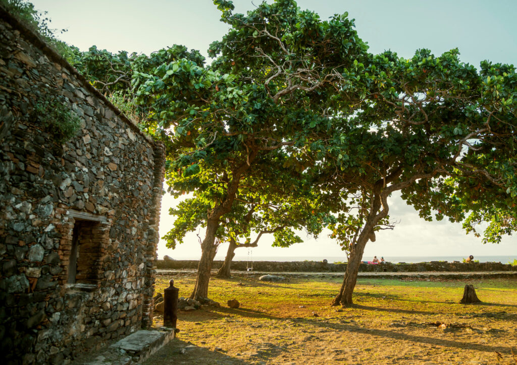 Ruínas e canhões antigos contam a história militar da ilha. As crianças adoram explorar as antigas construções militares do Forte Nossa Senhora dos Remédios enquanto aprendem sobre a história da ilha. Foto: Bruno Lima – MTur
